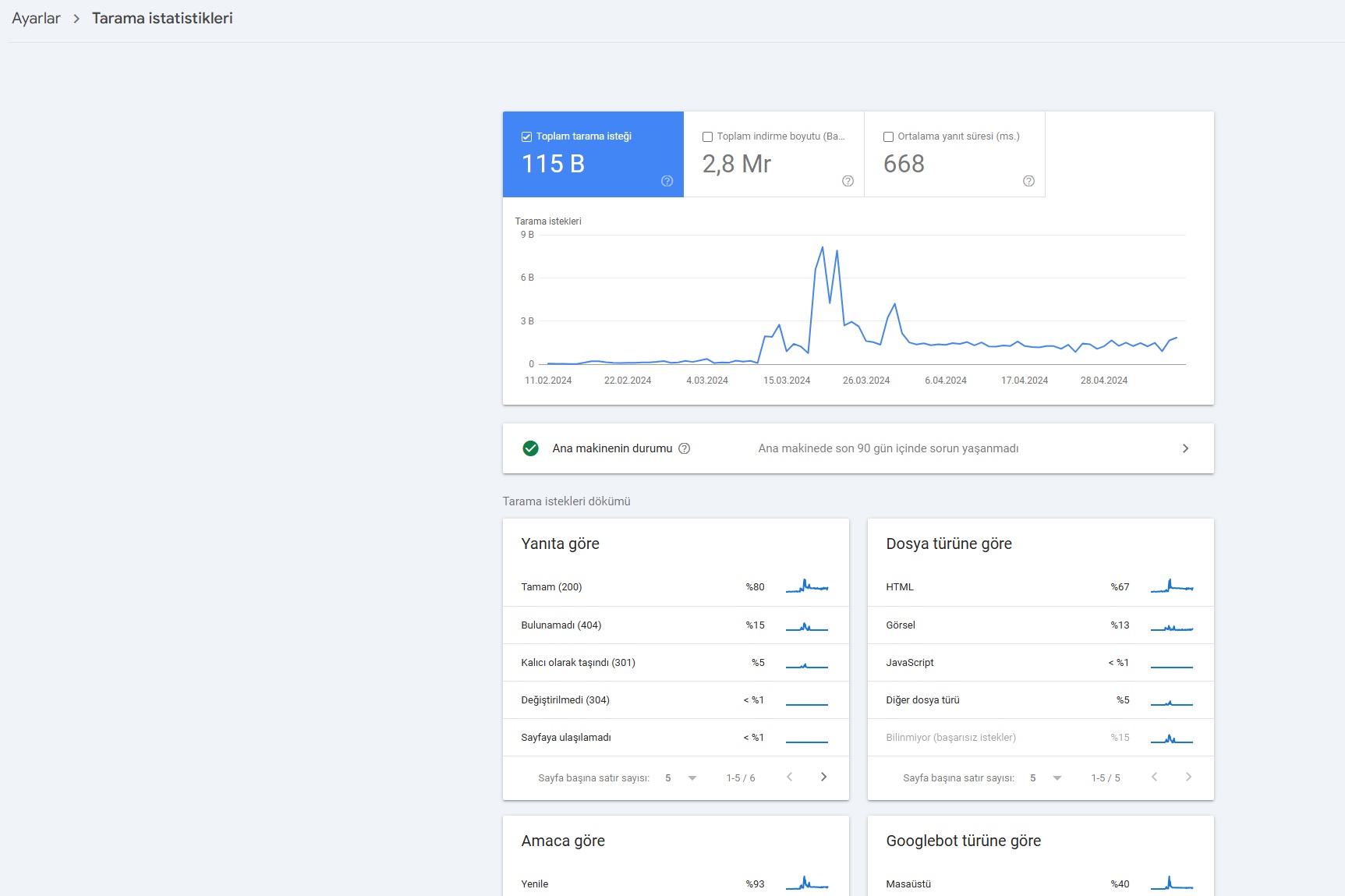 Tarama istatistikleri raporundan detaylı olarak ne kadar taranma isteğinde bulunulduğu, hangi url adreslerinin tarandığını vb. verilere ulaşabiliyoruz.